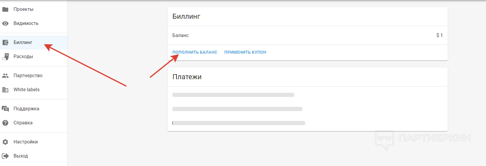 Чтобы пополнить счет, переходим в раздел «Биллинг». Далее откроется страница, где нужно выбрать «Пополнить баланс».