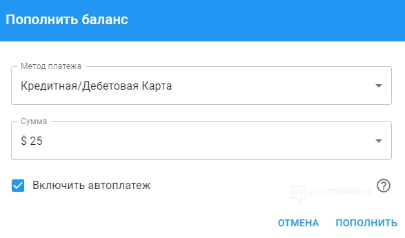 Также можно включить автоплатеж, благодаря чему система будет автоматически снимать деньги с карты в тот момент, когда баланс в личном кабинете будет ниже $1.