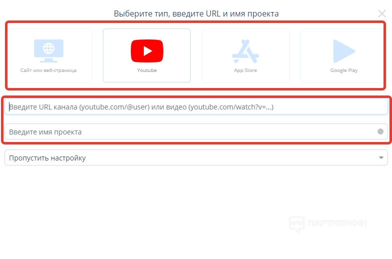 Выбираем подходящий вариант, после чего заполняем форму. Для этого нужно указать ссылку на веб-ресурс и название проекта.