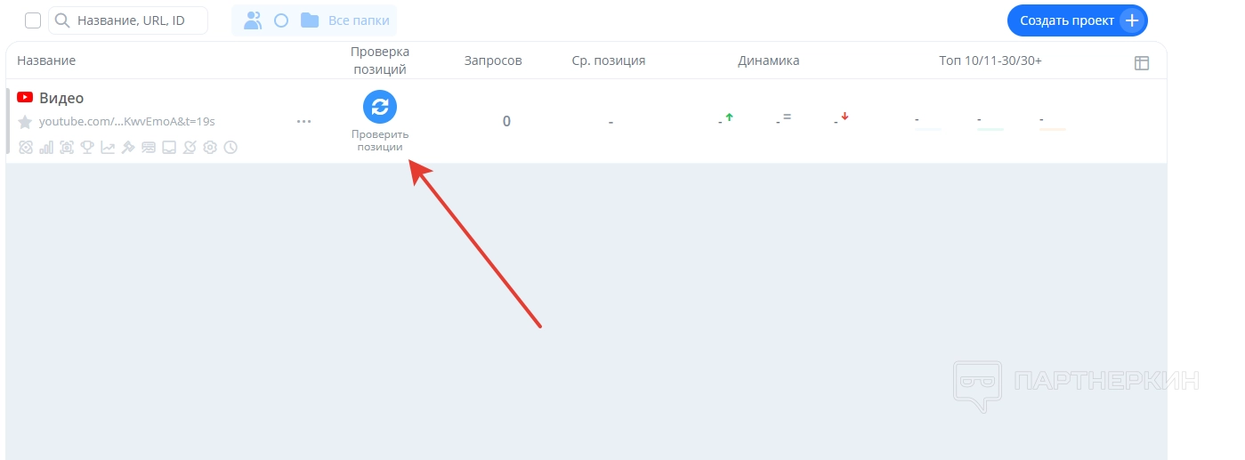 Когда система подтянет указанный ресурс, на странице отобразится табличка, где будет добавленный проект и инструмент для анализа данных. Чтобы получить сведения по ресурсу, жмем на кнопку «Проверить позиции».
