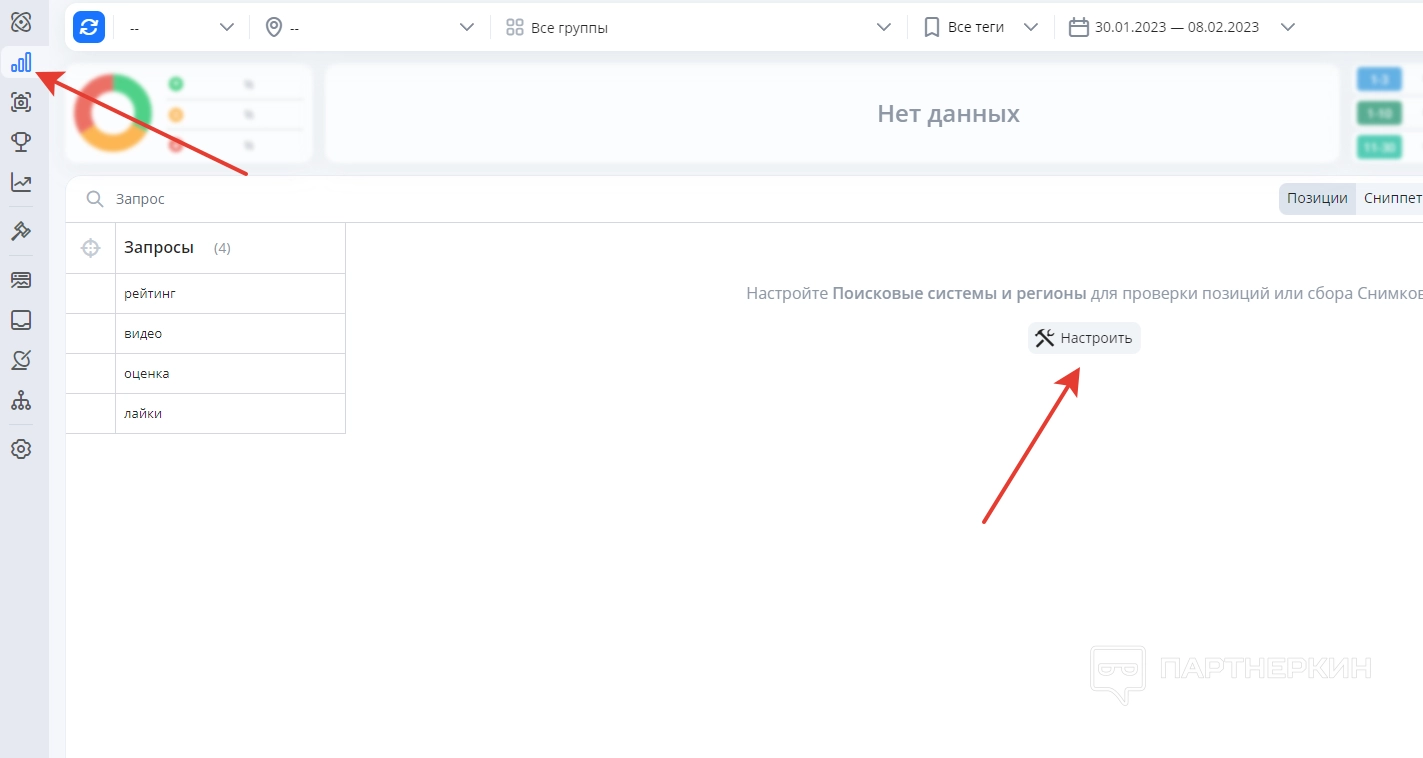 Теперь нужно настроить проверку позиций. Для этого кликаем на значок с тремя полосками в левой панели управления, после чего нажимаем на кнопку настройки в центре экрана.