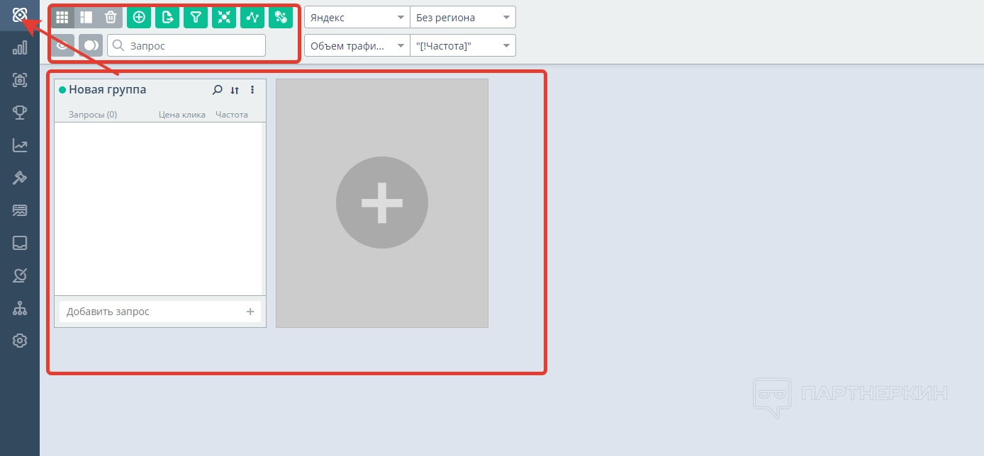 Под панелью с инструментами находится дашборд, где можно создавать группы с поисковыми запросами.