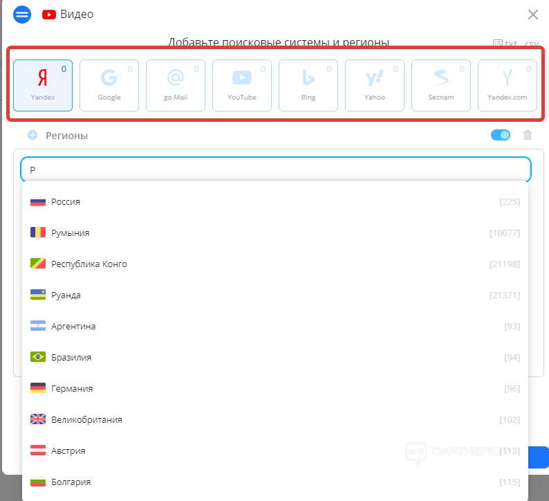В процессе настройки выбираем поисковую систему и указываем конкретный регион с помощью соответствующей строки. На момент написания статьи сервис поддерживал следующие поисковики: