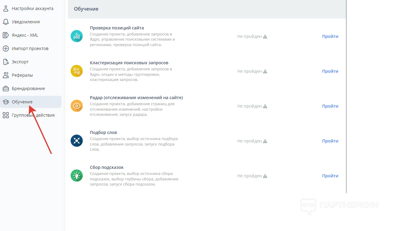 В разделе «Обучение» можно пройти обучение по работе с определенными блоками сервиса. Пользователю достаточно выбрать необходимый вариант, кликнуть на «Пройти» и следовать подсказкам, которые будут отображаться в специальной форме.