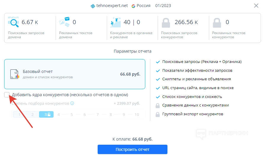 Также можно получить семантические ядра конкурентов, поставив галочку в соответствующем месте, однако услуг в этом случае будет стоить в несколько раз дороже.