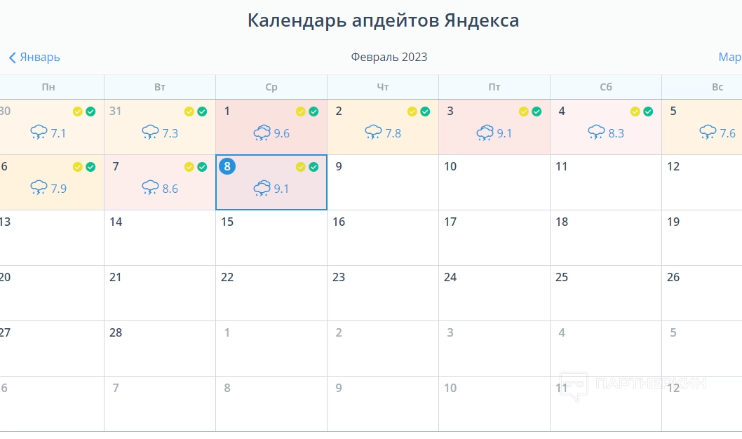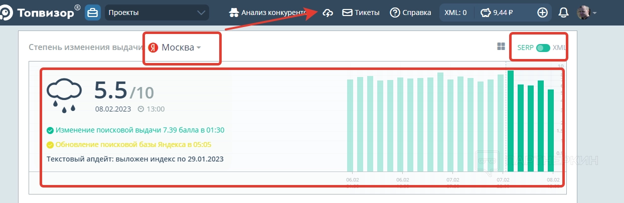 Ниже идет блок, в котором изменения по поисковой выдаче отображаются в виде графика и оценки по 10-бальной шкале. Также предоставляется информацию о времени, в которое было совершено последнее обновление выбранной поисковой базы.