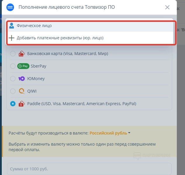 Если нужно добавить другие реквизиты для юридического лица, кликаем на физическое лицо и выбираем «Добавить платежные реквизиты (юр.лицо).