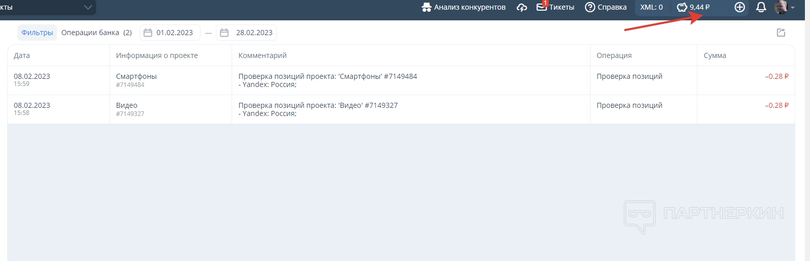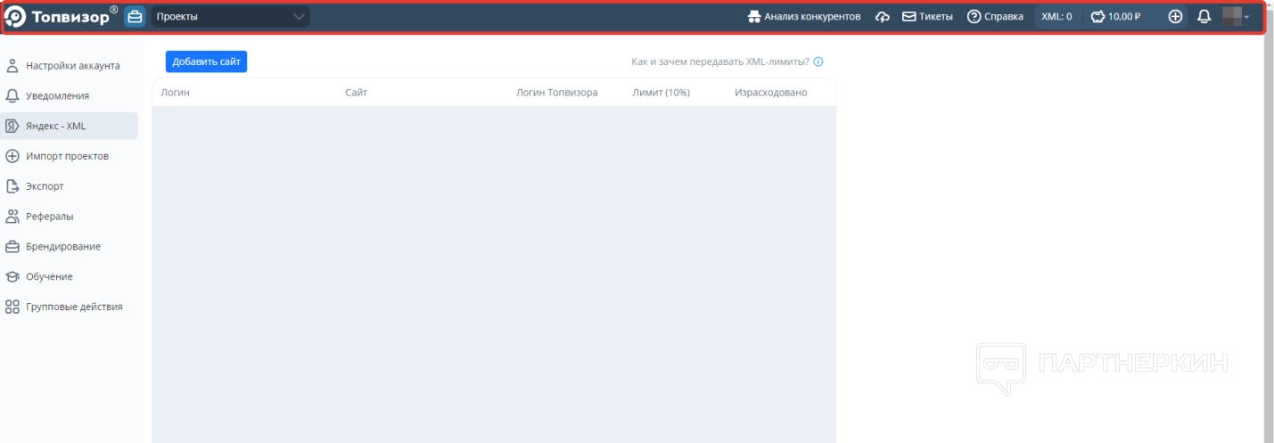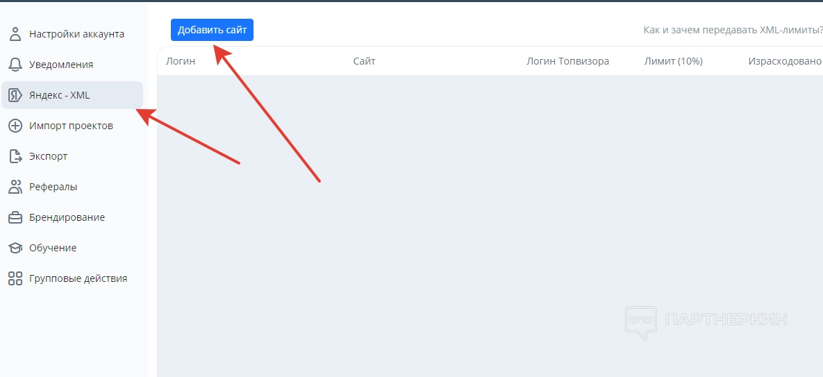 - XML. Здесь отображаются XML-лимиты по добавленным сайтам.