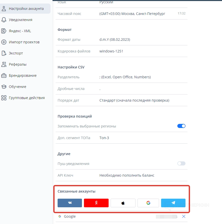 В анкете содержится такая информация, как логин, электронная почта, краткая информация о владельце, пароль, язык интерфейса, часовой пояс. Ниже можно выбрать формат даты, откорректировать настройки CSV и указать ТОП дополнительного сегмента. Также в настройках аккаунта подключаются учетные записи от ВК, Telegram, Google, Apple ID и Яндекс.