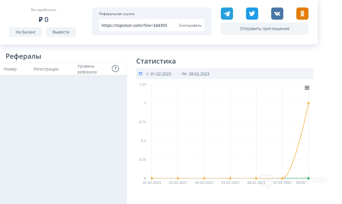 В блоке «Рефералы» отображается партнерская ссылка и информация по добавленным рефералам (номер, дата регистрация и уровень доверия). Информация из статистики отображается в виде графика. Также радует, что в сервисе есть специальные кнопки для приглашения потенциальных рефералов с помощью Telegram, ВК, Twitter и Одноклассники.