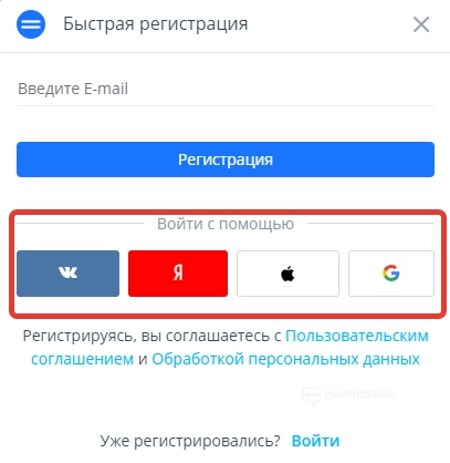 Регистрация здесь проходит довольно быстро: пользователю нужно всего лишь указать электронную почту, на которую придет письмо с доступом. Также есть возможность авторизации с помощью аккаунтов ВК, Яндекс, Apple ID и Google. Выбираем подходящий вариант и завершаем регистрацию.