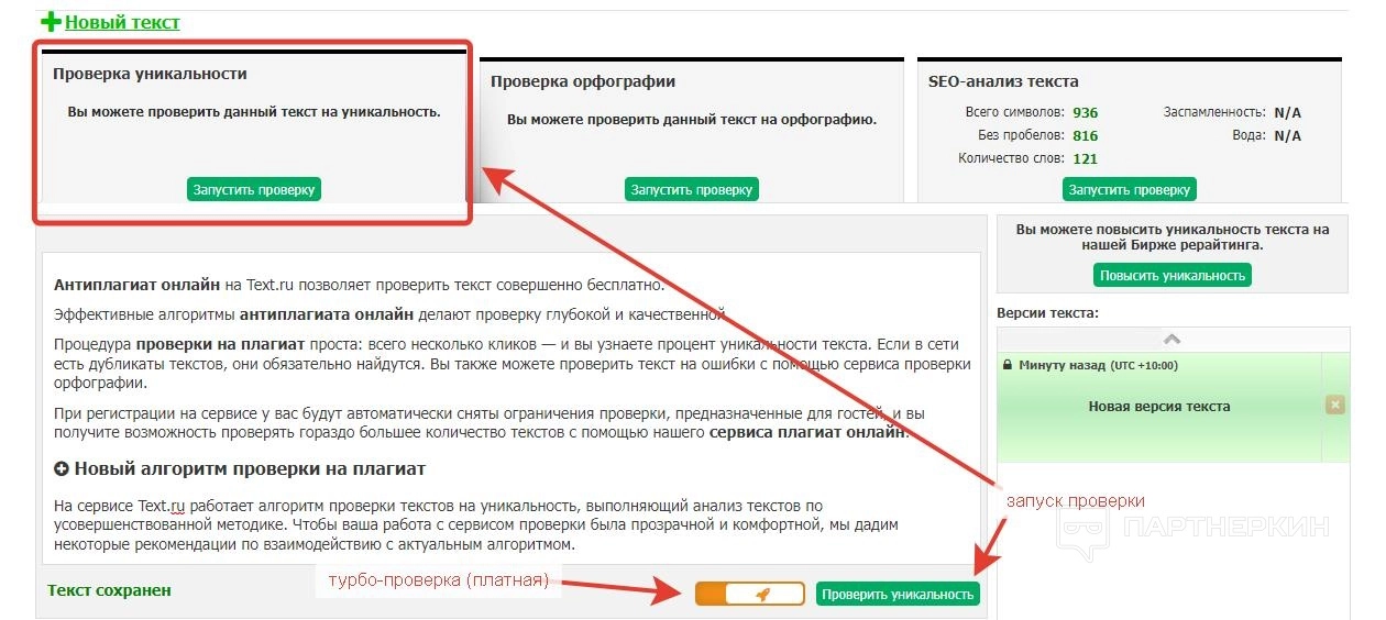 - Можно запустить турбо-режим – это значит, что текст проверяется вне очереди. Это намного быстрее, чем стандартный способ, но при этом списываются оплаченные символы. Для включения опции нужно щелкнуть по кнопке с иконкой ракеты.