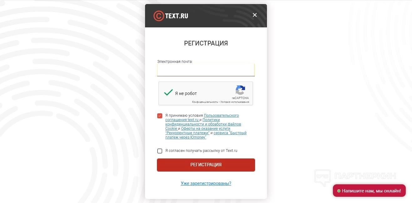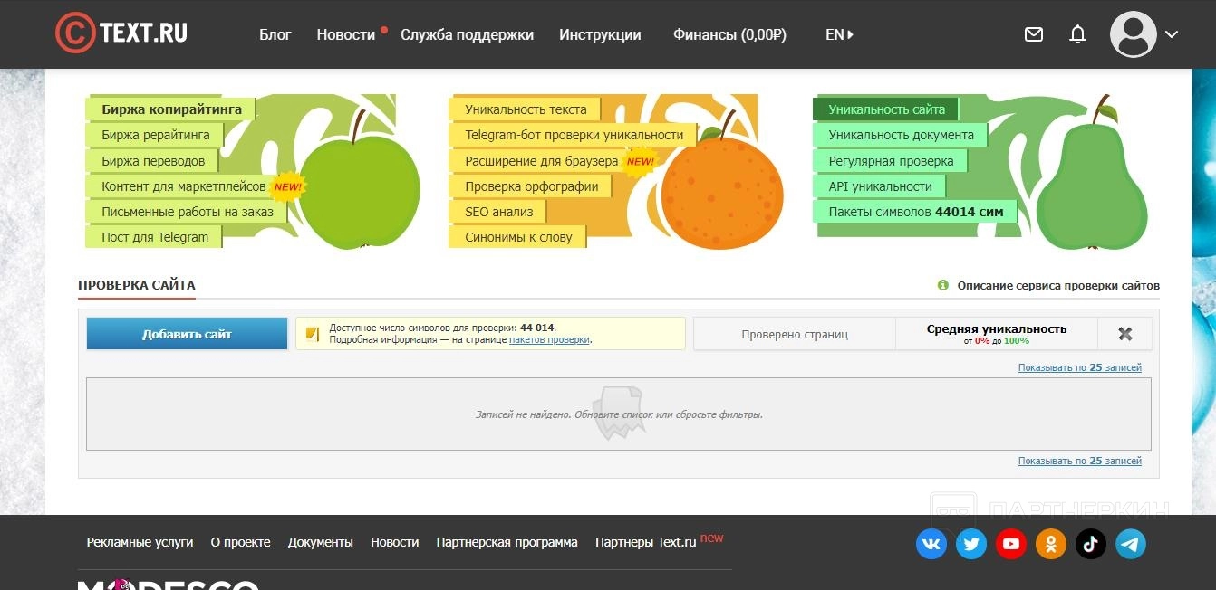 Сервис разрешает использовать некоторые инструменты (проверка текста и орфографии, синонимайзер) без регистрации. Однако основная работа, а также продвинутые инструменты (регулярная проверка, API, проверка сайта) открываются после создания аккаунта. Также регистрация увеличивает бесплатные лимиты.