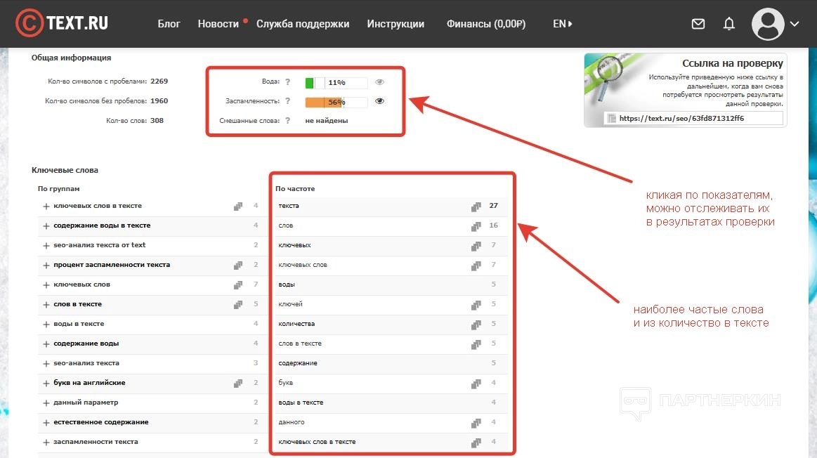 Результаты отображаются в правой колонке и под текстовым полем. Сервис отображает следующие показатели:
