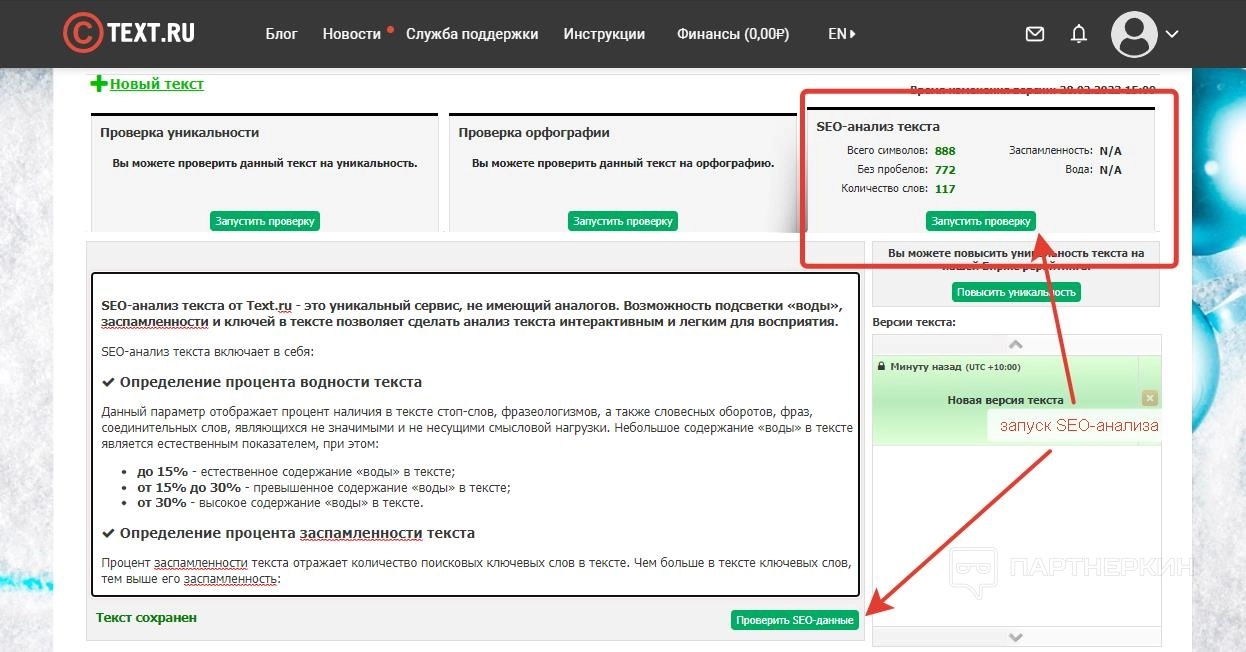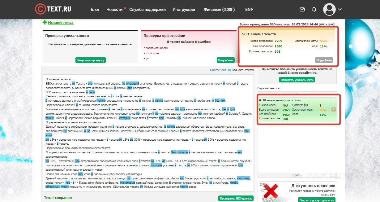 SEO-анализ проводится автоматически во время стандартной проверки на уникальность. Однако его также можно запустить отдельно. Для этого требуется вставить текст в поле проверки и кликнуть «Проверить» в боксе «SEO-анализ текста».