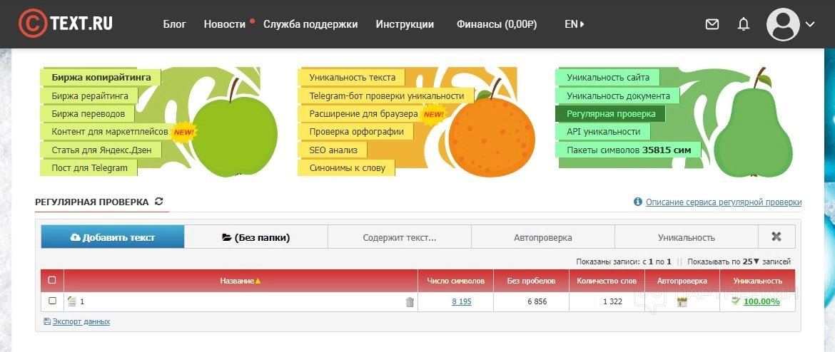 На сервисе можно полностью бесплатно проводить SEO-анализ и проверку орфографии. Также разрешается проверять через антиплагиат 15 000 знаков в сутки зарегистрированным пользователям. Когда лимит закончится, потребуется приобрести платные пакеты. Наиболее популярные варианты: