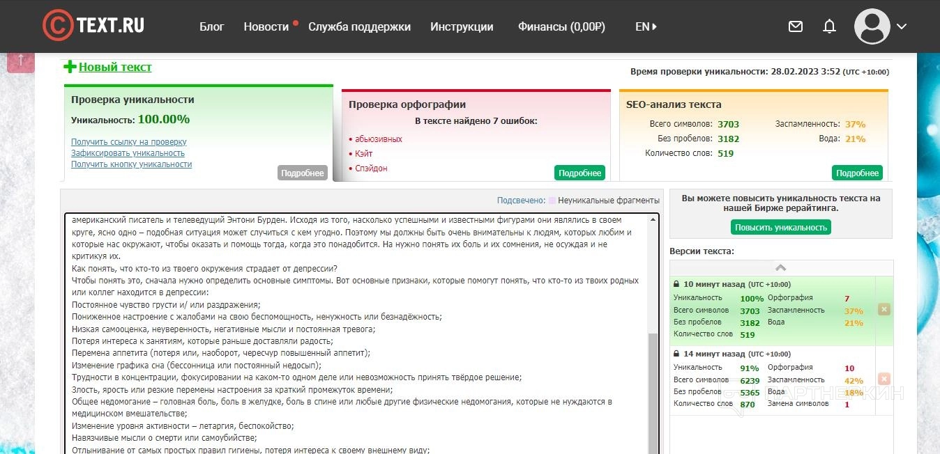 При результате 100% можно зафиксировать авторство и получить кнопку уникальности. Если в дальнейшем кто-то попытается украсть статью, это докажет авторские права и укажет, когда был создан оригинальный текст.