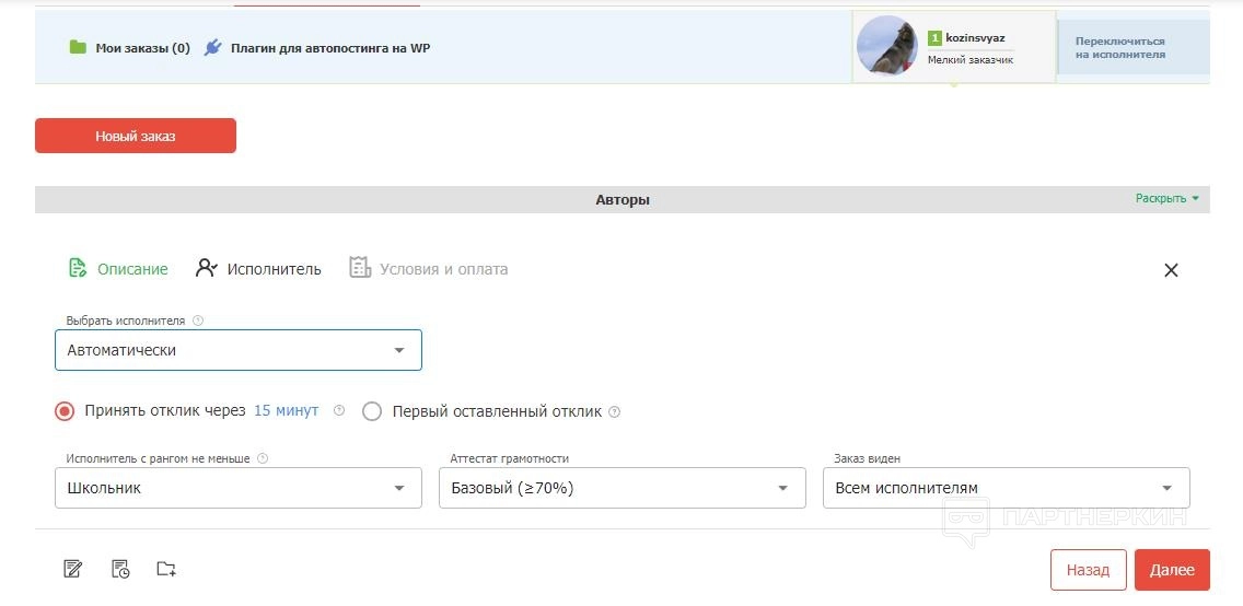 Если заявка будет приниматься в автоматическом режиме, то требуется уточнить условие: одобрять заявку через какое-то время либо принять первого исполнителя. Можно создать индивидуальный заказ – в этом случае требуется выбрать автора из белого списка либо набрать имя в поисковой строке.