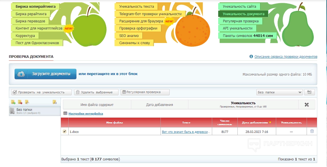 В разделе «Уникальность документа» пользователям доступна проверка любого текстового файла размером до 10 МБ. Поддерживается формат txt, pdf, rtf, doc, docx, html и другие.