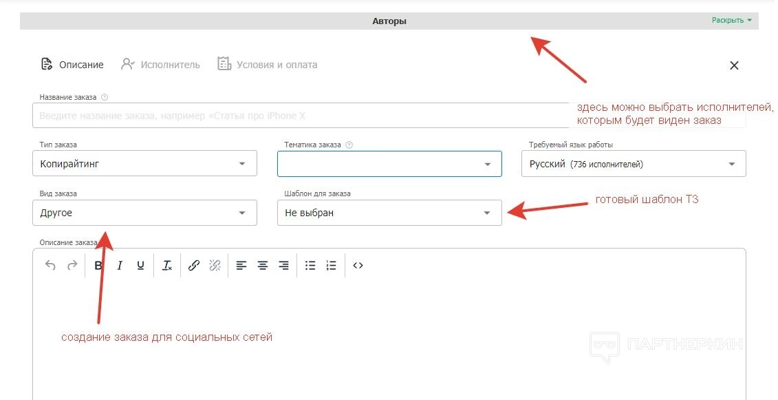 Сервис позволяет использовать готовые шаблоны заказов – этот пункт настраивается в соответствующей строке. также можно отметить функцию «Мультизаказ» – его используют, если требуется создать несколько однотипных заданий.