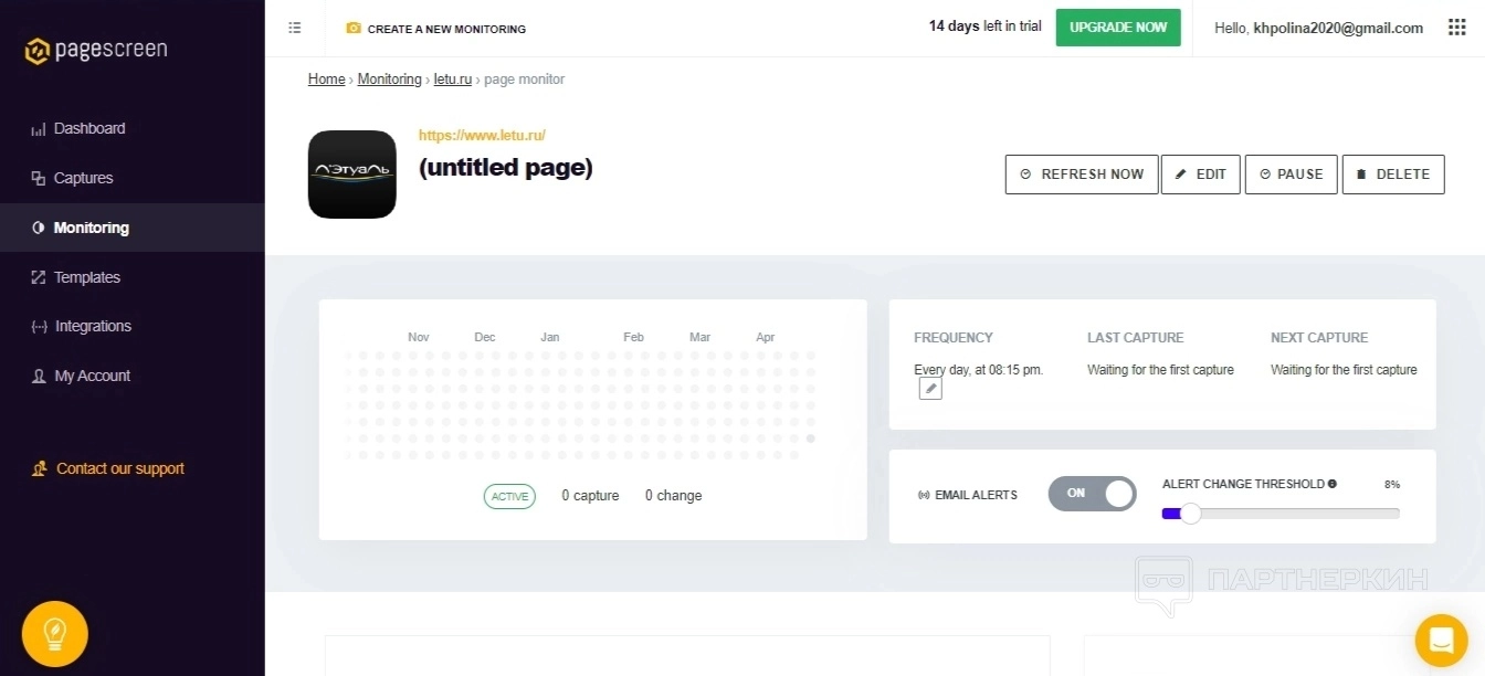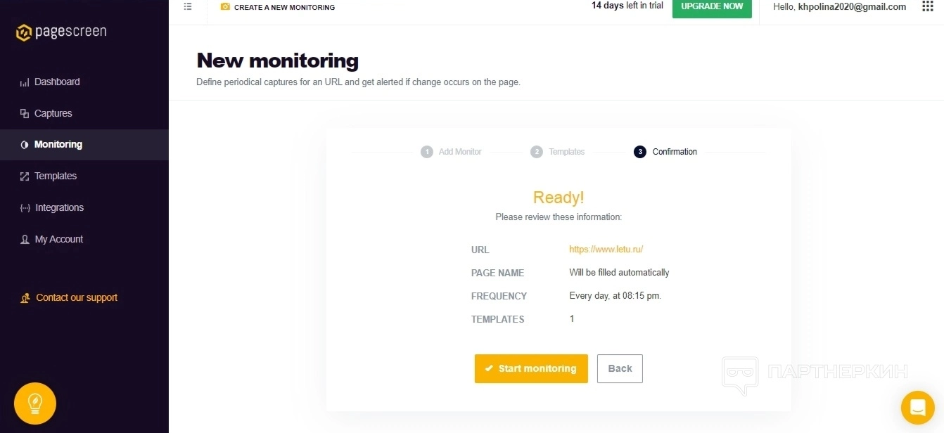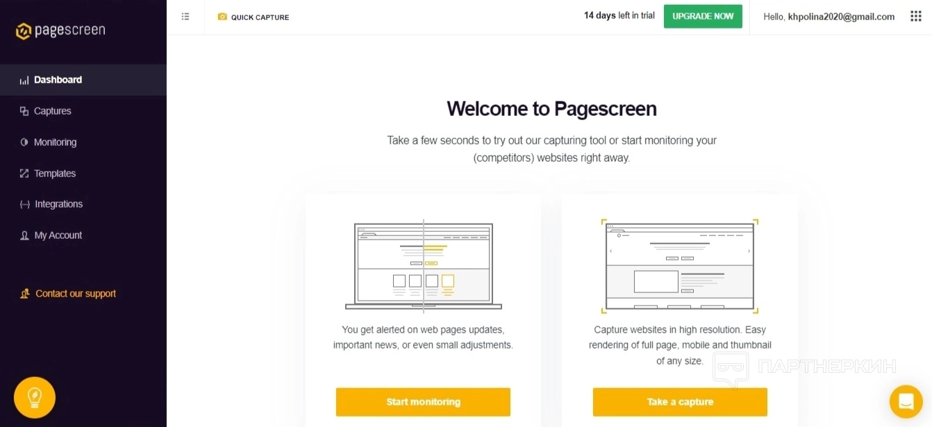 Основные разделы для взаимодействия находятся слева: интеграции, шаблоны, мониторинг, счет и скриншоты. В верхней части экрана находятся статус подписки и рабочий email, нажимая на который можно попасть в настройки кабинета. В правом нижнем углу находится чат техподдержки.
