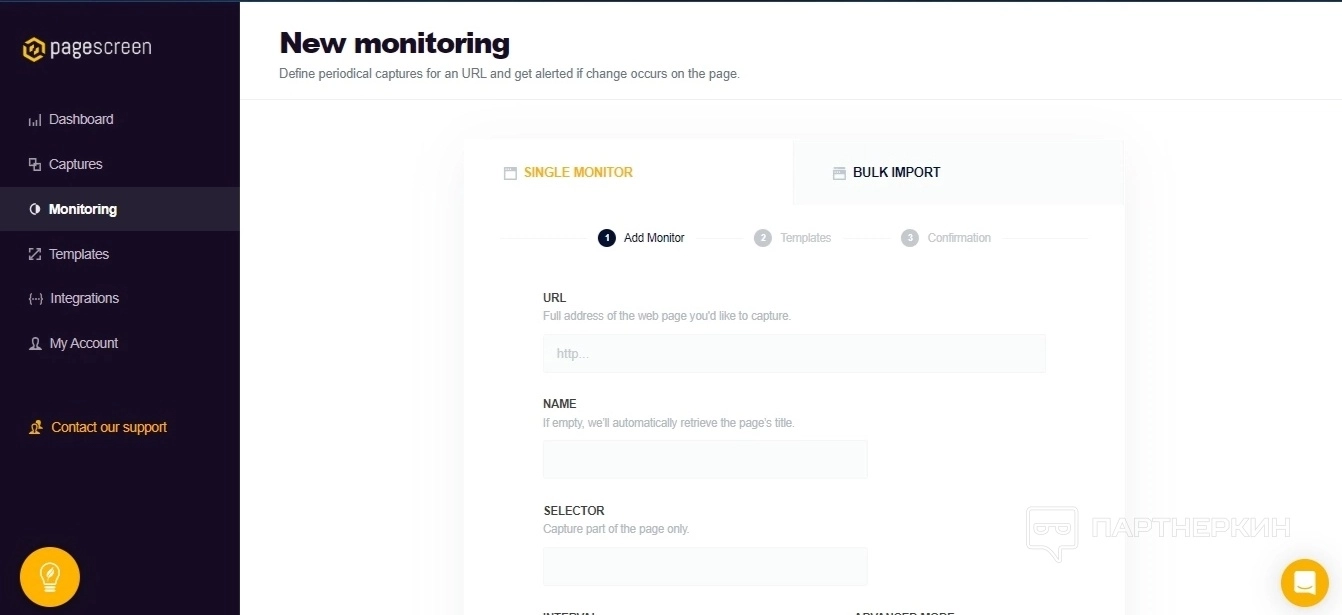 Открывается первый этап — добавление основных данных для мониторинга. Уже здесь пользователь может выбирать: отслеживать изменения на одном веб-ресурсе или создать сразу массовый импорт. В целом отличаться будут только способы указания ресурсов и количество настроек для каждого из них.