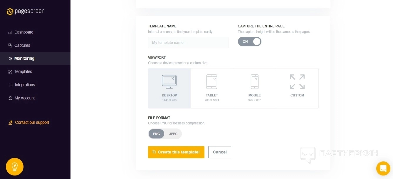 Вторым шагом необходимо выбрать шаблон, на который сервис будет ориентироваться при мониторинге сайта. Это может быть десктопный вариант снимка экрана, планшет или мобильное устройство.