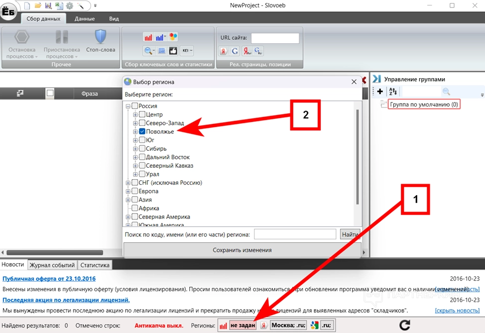2. Выберите регион, если товар ориентирован на конкретную страну (область). Кнопка находится в нижней части программы (1). Дальше отметьте галочками те регионы, где располагается основная ЦА (2). Если региона не выбраны, программа будет парсить по всему миру. Это займет очень много времени.