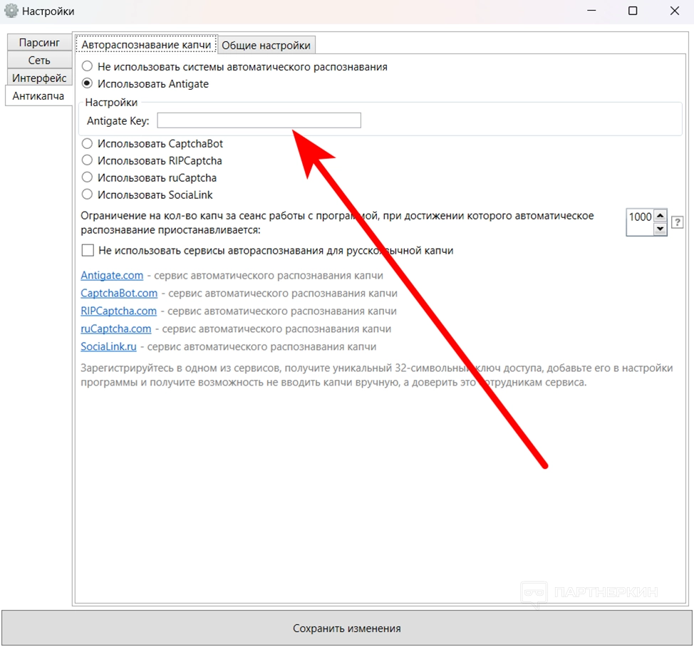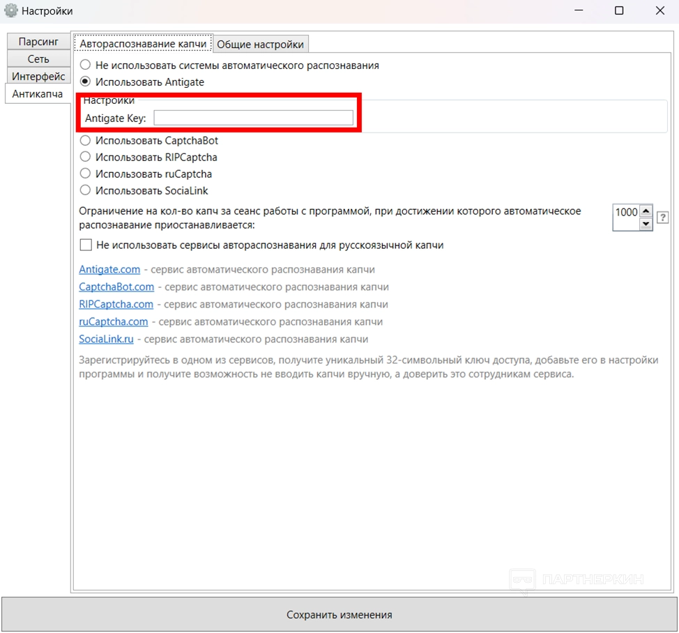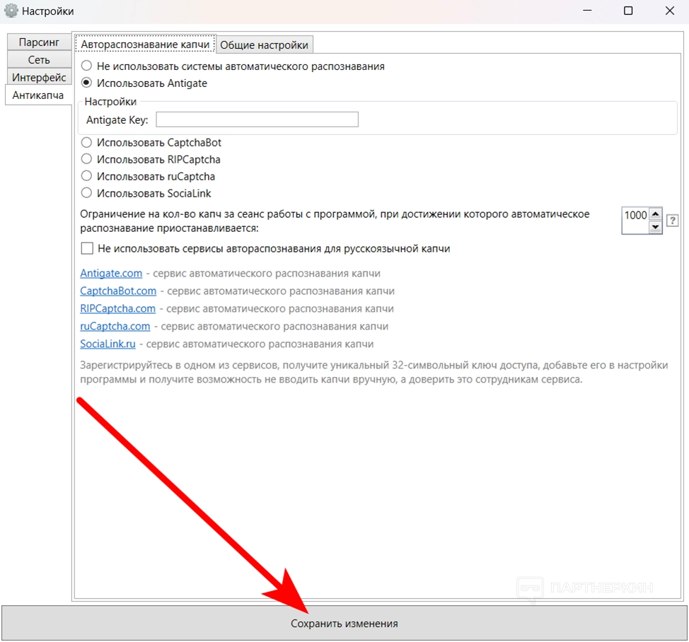 После регистрации на сайте получите уникальный ключ на 32 символа. Добавьте его в настройки программы и откройте возможность не вводить капчу вручную.