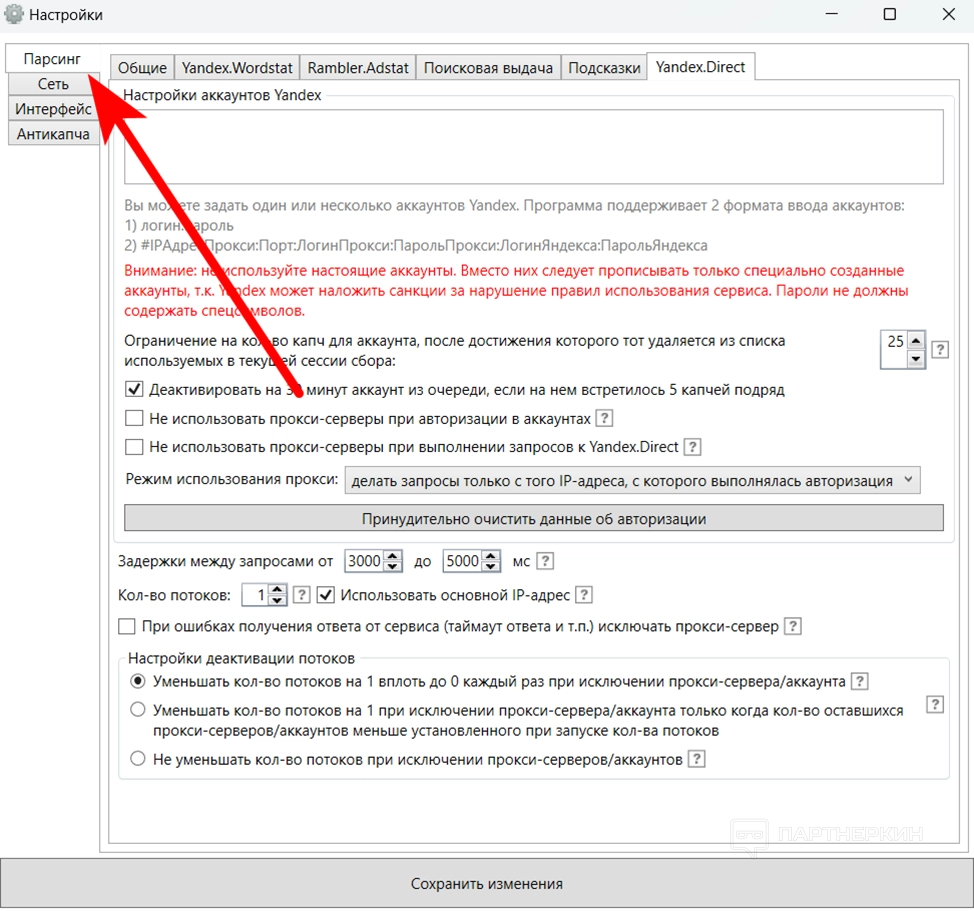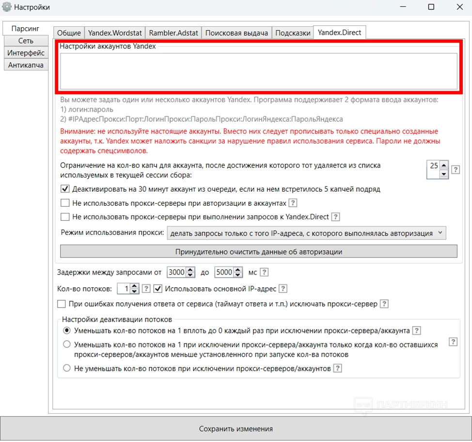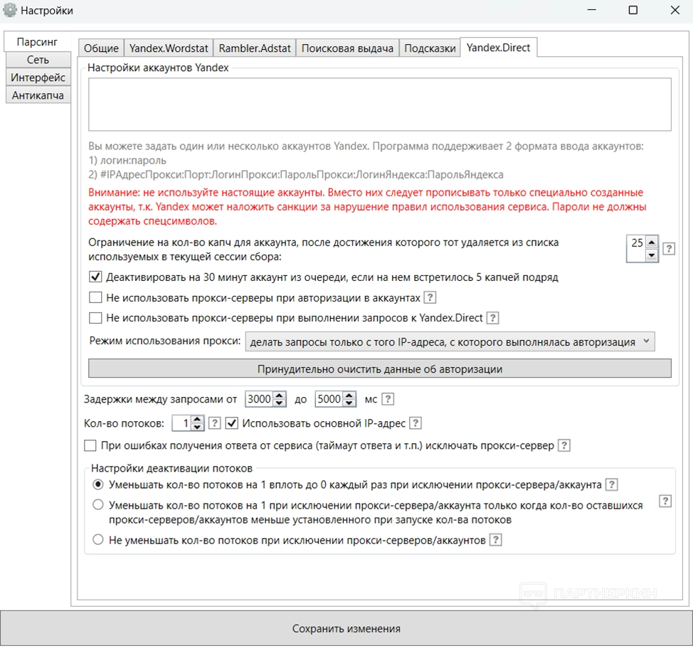 Самая первая вкладка. Здесь находятся настройки для автоматического сбора данных с сайтов-конкурентов. Администрация программы настоятельно рекомендует использовать фейковые аккаунты для парсинга, так как Yandex может наложить санкции за нарушения правил использования сервиса. Пароли не должны содержать спецсимволов.