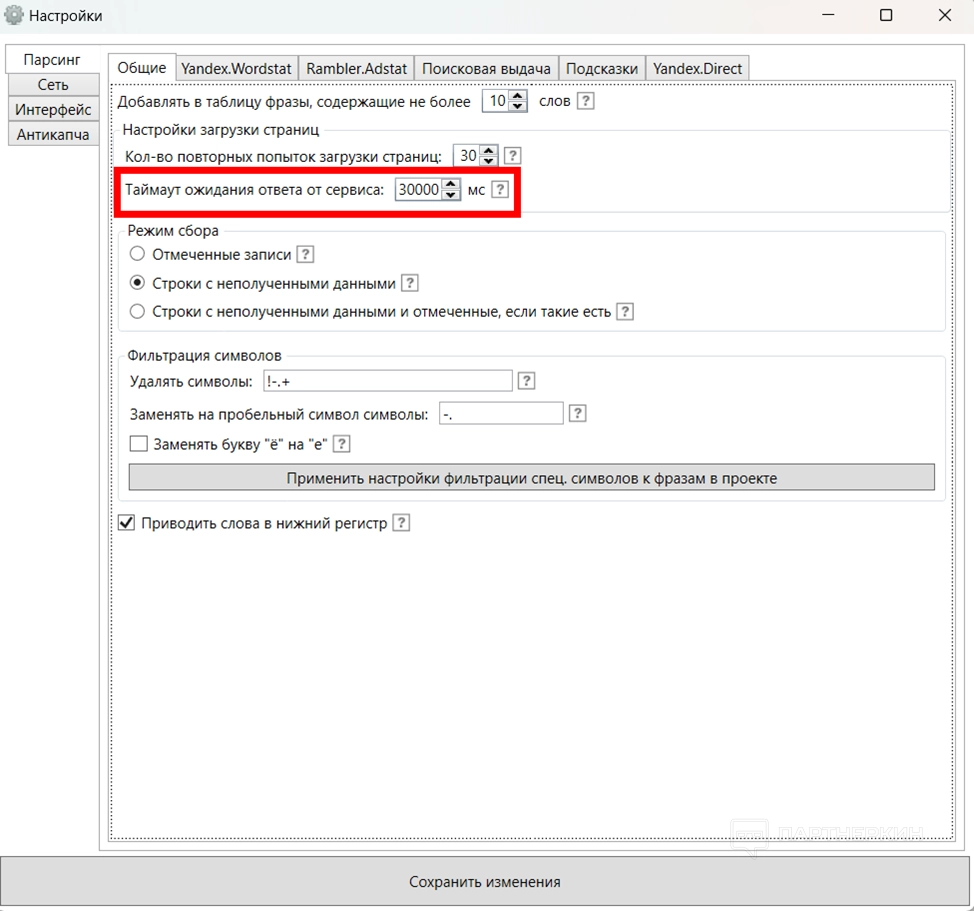 1. Выставите задержку между запросами. Слишком маленькие показатели увеличивают вероятность блокировки аккаунта. Поэтому оптимальной цифрой считают период 3 400-5 000. Выставите эти данные в разделах Yandex.Direct, «Поисковая выдача», Rambler.Adstat и Yandex.Wordstat.