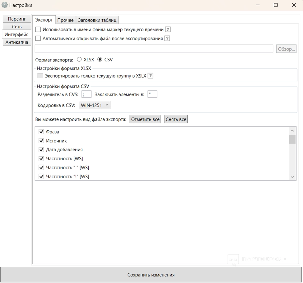 1. Экспорт. Выгрузка таблицы в виде документа Excel. Доступны форматы XLSC и CSV. Можно настроить тип экспорта по ключевым словам, кодировке и другим показателям.