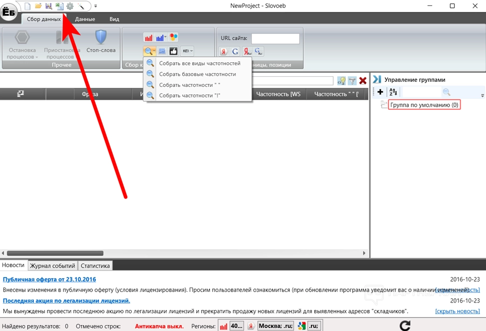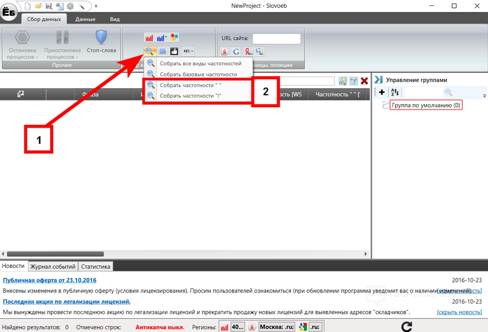 1. В главном окне программы нажмите кнопку в виде лупы (1). Нас интересуют две кнопки: «Сбор частотности “ ”» и «Сбор частотности “!”» (2).