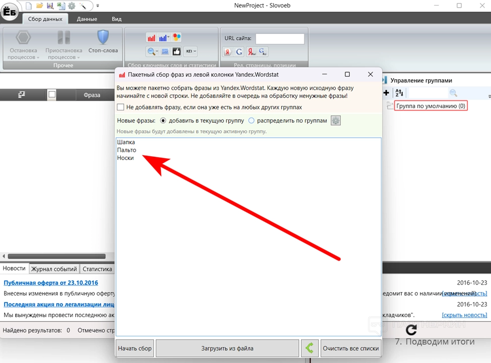 Выберите, из каких поисковых систем нужны подсказки. Поставьте галочку, чтобы не добавлялись фразы, которые уже есть в других группах.