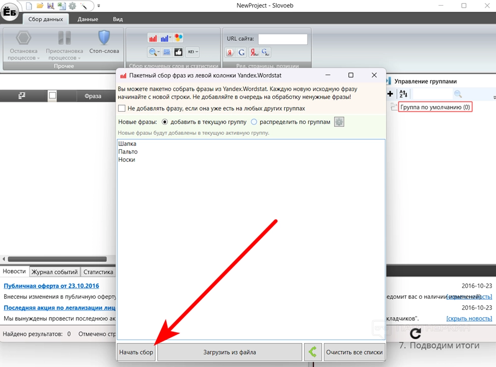 1. Нажмите на кнопку «Начать сбор». Подождите, пока программа собирает тематические ключи.