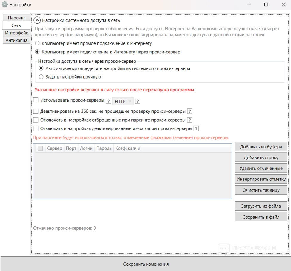 Это настройка прокси-каналов. Можно выбирать методы сбора семантического ядра. Обычным способом (используя реальный IP и отпечаток компьютера) или через прокси-адреса.