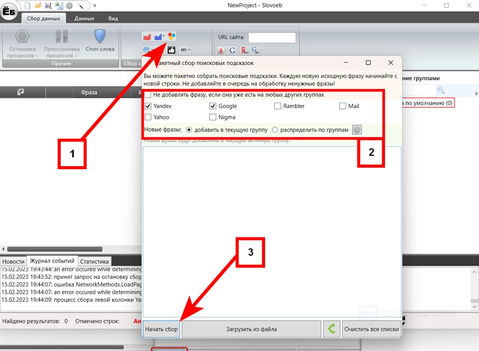 Чтобы спарсить подсказки в выдаче, нажмите главном окне соответствующую кнопку (1). Затем выберите маркеры и необходимые настройки (2). Нажмите на кнопку «Начать сбор» (3).
