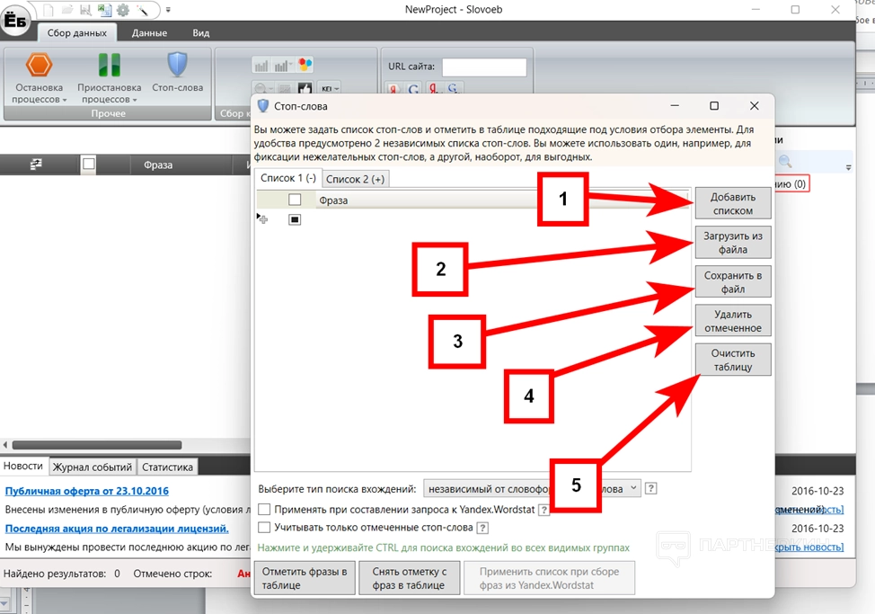 2. Появится новое окно. Нажмите кнопку «Добавить списком» (1). Или загрузите текстовый файл в формате .txt с готовыми словосочетаниями (2). Также набранные вручную слова можно сохранить на жестком диске (3). Если ключевик не нужен, удалите его (4). Есть кнопка очистки всей таблицы (5).