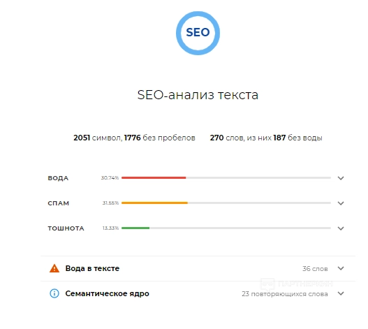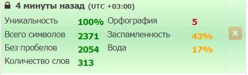 Кстати, Text.ru показал абсолютно другие значения касательно воды и спама (и кому теперь верить…):