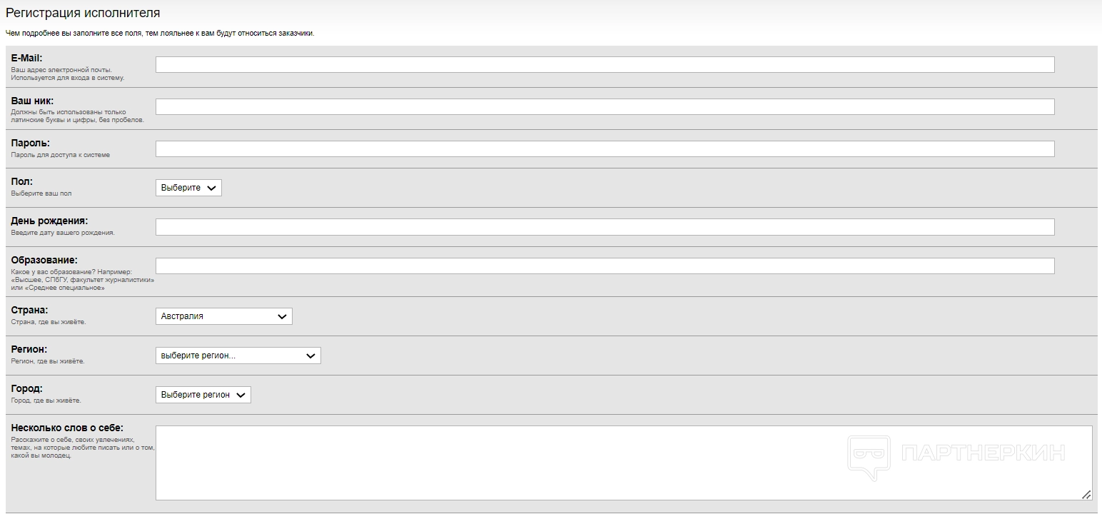 - Заполнить основную информацию о себе. Большая часть пунктов — стандарт, кроме образования. Данный пункт иногда опускают, либо высылают подтверждение непосредственно платформе в виде скана диплома. Не порадовало, что сходу надо заполнять слова о себе — на месте новичка можно запнуться именно об этот пункт.