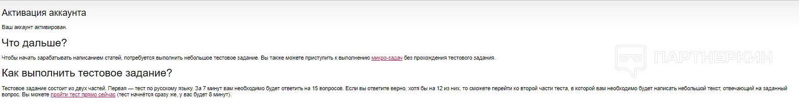 - Учетная запись активирована — осталось только пройти соответствующее тестирование, чтобы понять уровень копирайтера. Первая из них — тест по русскому языку. Вопросы не сложные, напоминают школьный уровень по темам синтаксиса и пунктуации. Достаточно ответить верно на 12 вопросов из 15.