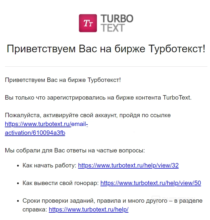 - На почту придет сообщение — необходимо перейти по ссылке для подтверждения своей учетной записи. Помимо этого внутри письма будут основные ссылки по часто задаваемым вопросам («Как вывести деньги?», «Как начать работу?», «Где искать ответы на другие вопросы?»).