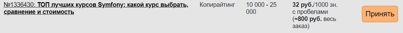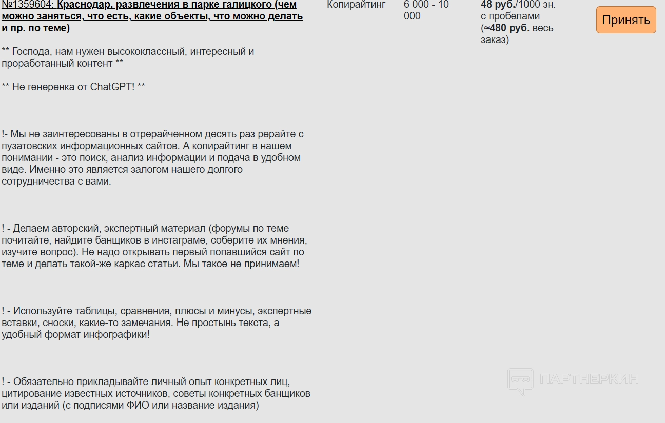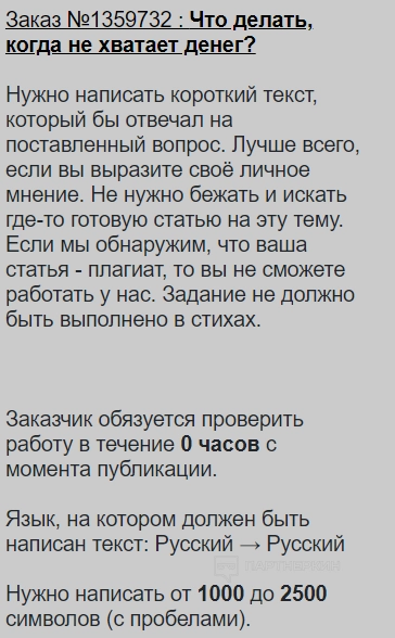 К сожалению, платформа не возымела слишком широкого успеха среди заказчиков — отчасти по этой причине заказов крайне мало. Стоимость выполнения, конечно же, радует, потому что даже на самых начальных этапах можно не перебиваться «2к символов по 10 рублей/1000 (20 рублей за текст)». Само техническое задание уже отформатировано под «только не искусственный интеллект!»: