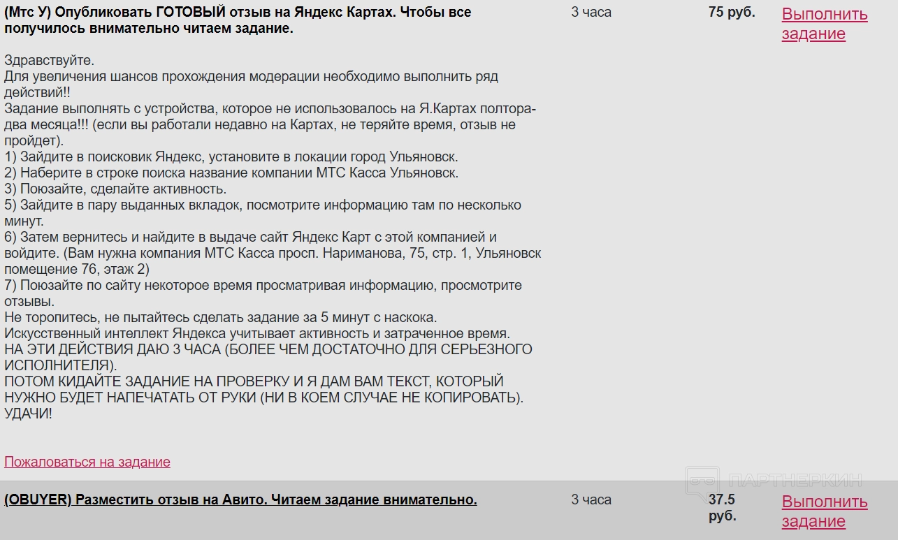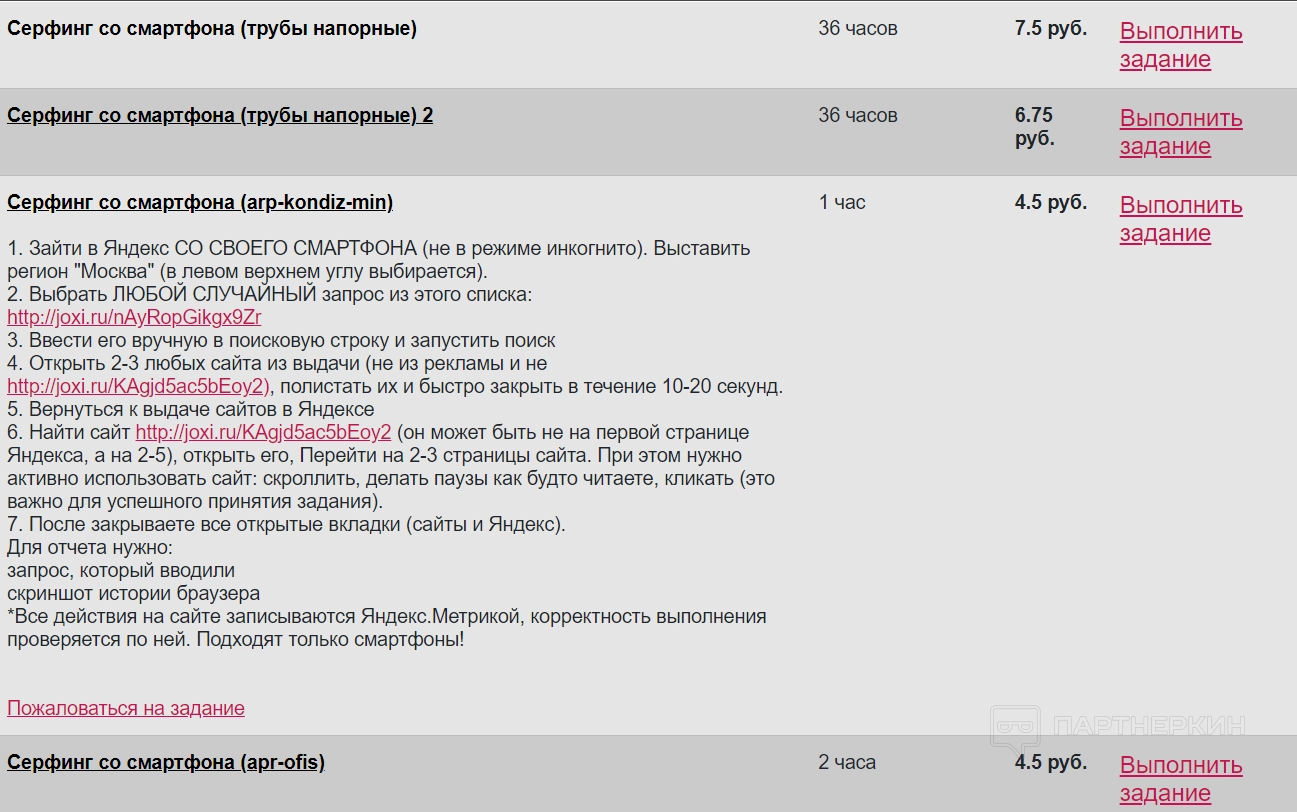 Задания крайне разнообразные — не только «посетить веб-сайт», «открыть страницу», «оставить отзыв», но и более узкопрофильные. Внутри каждого из разделов имеется кластеризация по авторам заявки. Личная оценка может быть названа следующим образом: