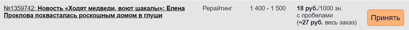 - Рерайтинг — «Повысь уникальность/перепиши своими словами/сократи текст». Самый простой тип работы, который подразумевает работу с уже готовым наброском текста или источником. Для новичков минимальная стоимость заказа составляет 20 рублей за 1000 символов, для профессионалов — 100 рублей за 1000 знаков.