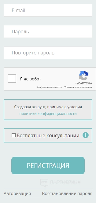 В стандартной форме нужно ввести электронную почту, придумать пароль, нажать галочку «Я не робот» и кликнуть на «Регистрация».