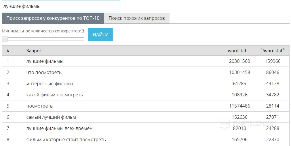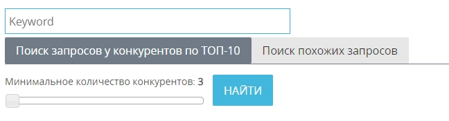 Расширение запроса похожими . В поле «Keyword» пользователь указывает ключевое слово, устанавливает минимальное количество конкурентов и нажимает кнопку «Найти».
