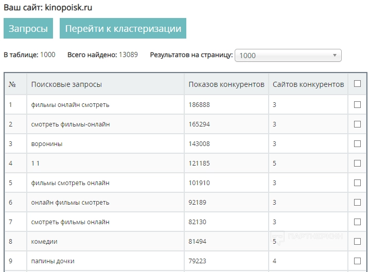 Подбор и кластеризация запросов . Использование этой функции поможет собрать список запросов для семантического ядра. Сервис анализирует регион, тематическую нишу сайта и другие данные. На основе полученной информации пользователь получает список ключевых запросов по разным группам. Пример для сайта Kinopoisk.ru: