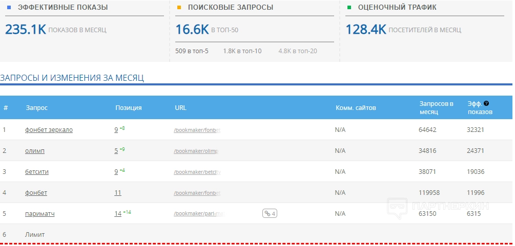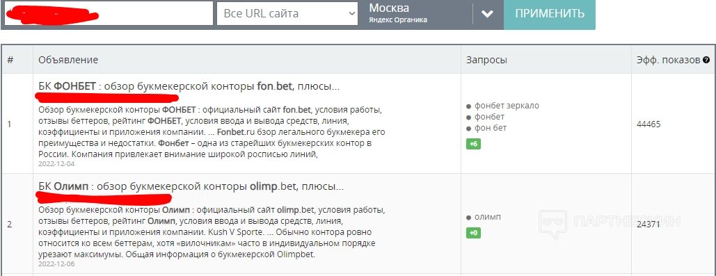 Видимость сайта . Функция помогает найти и проанализировать запросы, по которым ресурс занимает позиции в выдаче поисковых систем «Яндекс» и Google по заданному региону. Указав домен сайта, клиент получит информацию по эффективным показам, поисковым запросам и оценочному трафику: