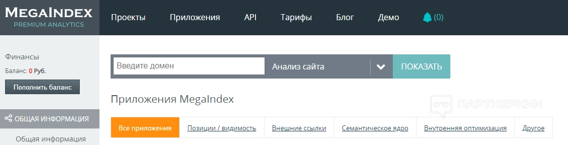 После регистрации клиента перенаправит в личный кабинет. В левом боковом меню находятся основные инструменты сервиса. Во вкладке «Общая информация» необходимо ввести URL исследуемого сайта. Выглядит это так: